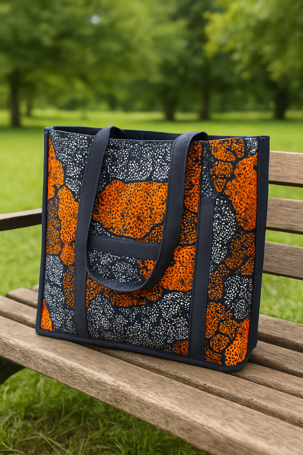 Turn heads wherever you go with this vibrant African print tote bag, crafted for both style and everyday function. Made with high-quality fabric featuring striking orange and navy patterns, this bag is the perfect blend of culture and modern fashion.